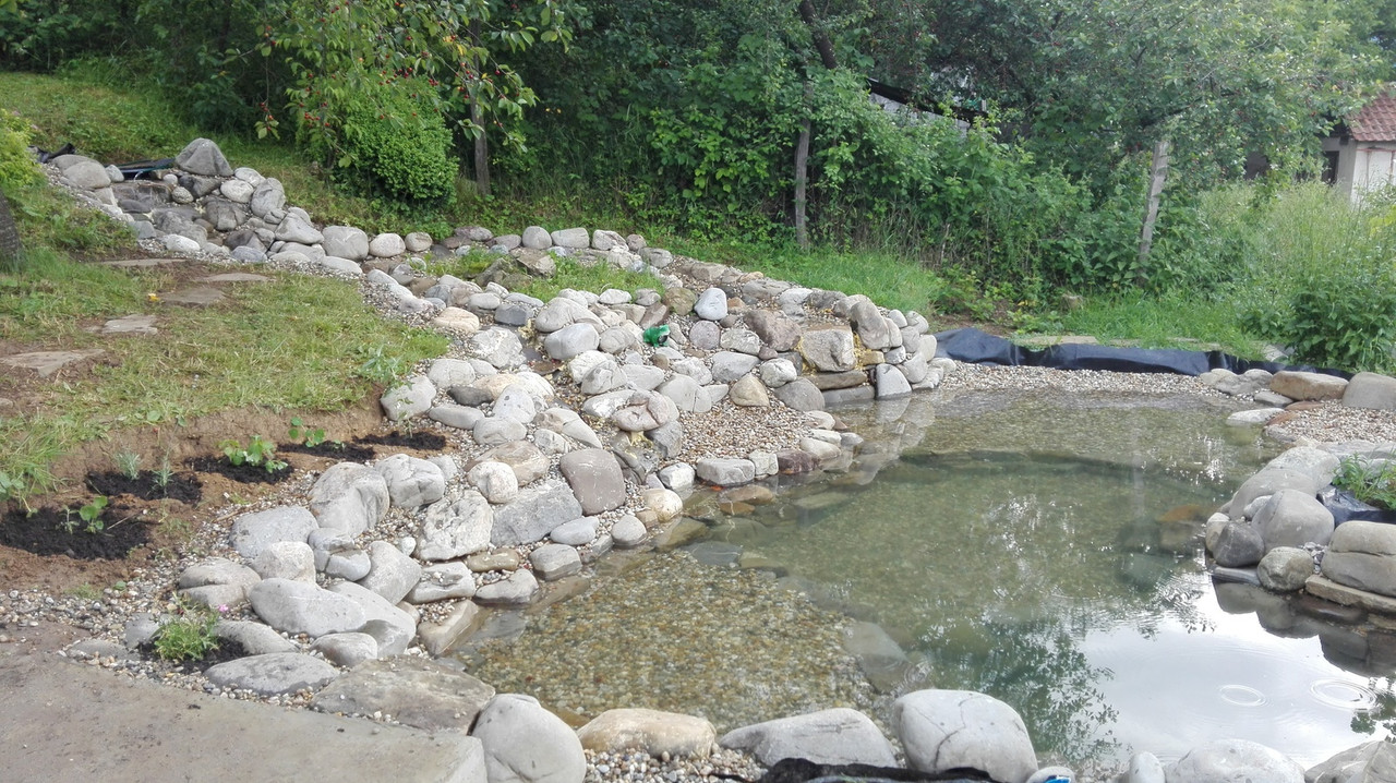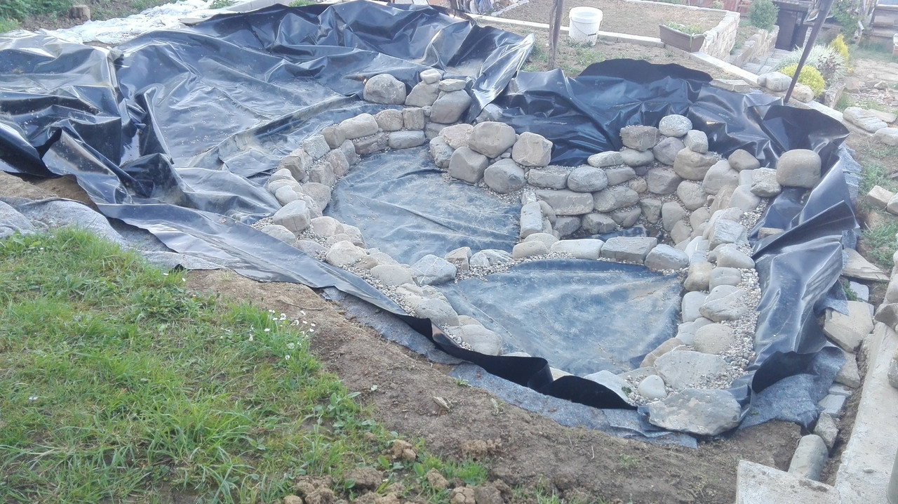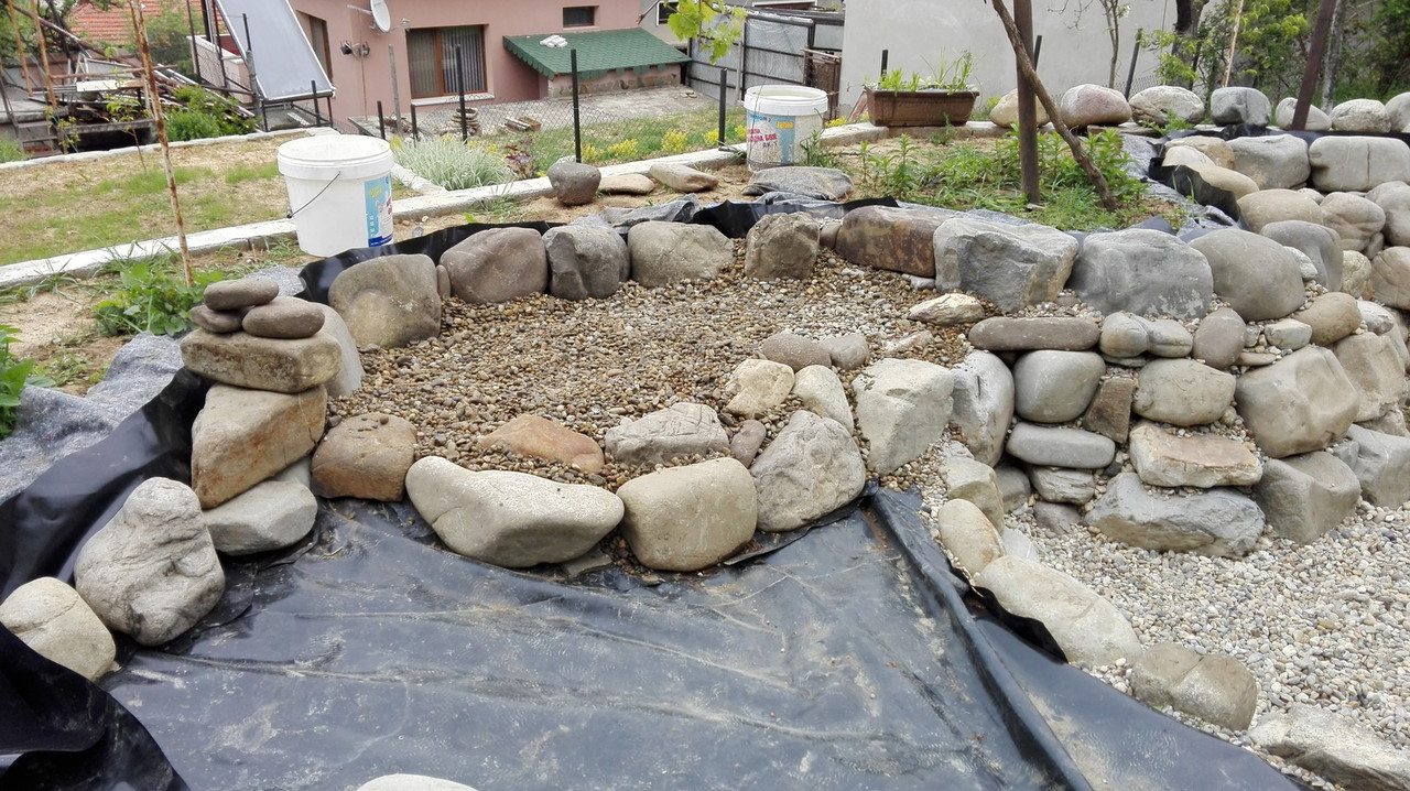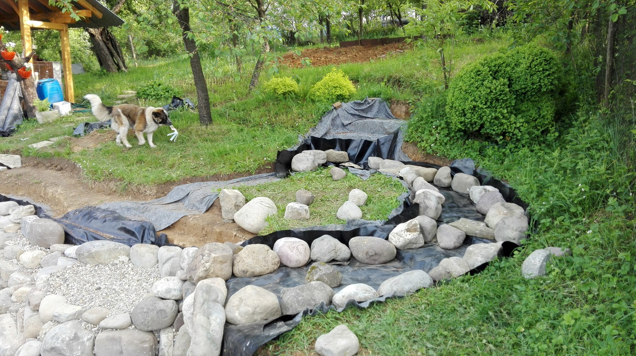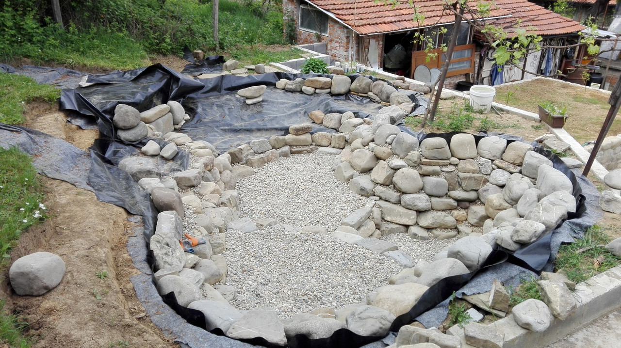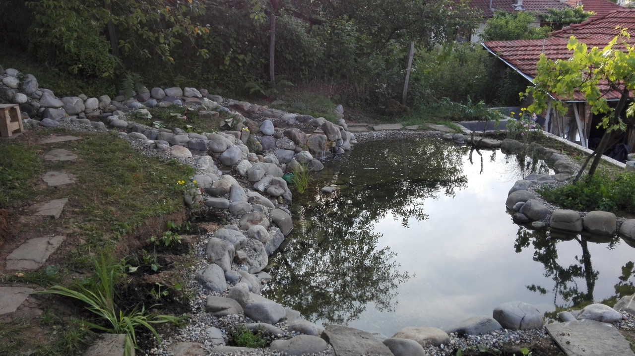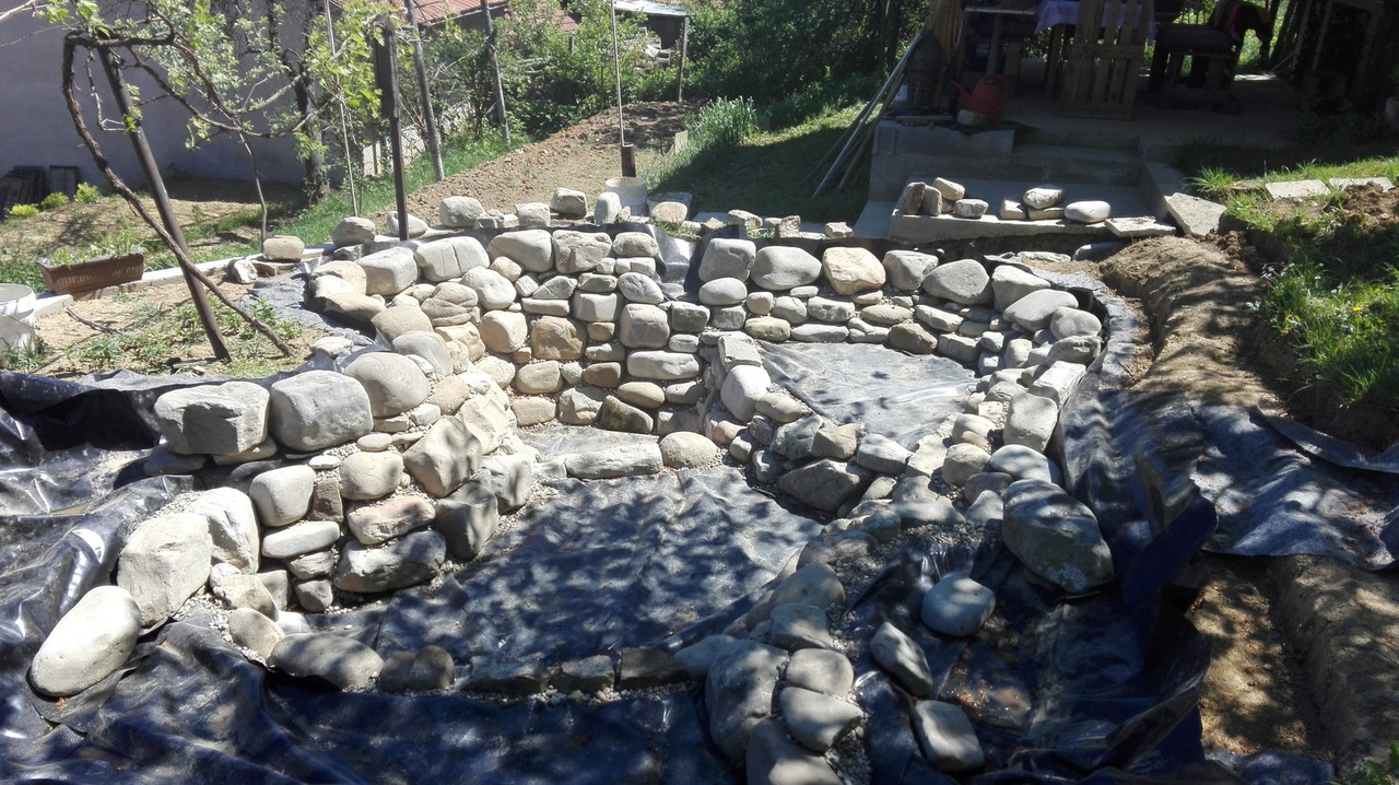 Много добре се получава , браво колега. Филца разбъркан ли е с цимент , ако не е може да се измие и камъните да паднат тук там но не е фатално. А дъното можеш да му направиш замазка силен разтвор цимент и пясък и докато е сурово още да растелиш филц  равномерно. Но така или иначе  след няколко месеца дъното няма да се вижда от какво е . Борда на езерцето как си го замислил , остави си повече запас от фолиото за да вдигнеш малко полезно е при силни валежи и вятър да не се пълни с боклуци и пръст. Късметлии са тези езерняци които имат по техния край такива камъни , аз не намерих.  Закопай си всички тръби и маркучи които ще ползваш за източване и доливане , спестява малко работа после. Предвиди си и преливник , при проливни валежи че съм виждал моето за 30мин. Порой как започва да прелива през преливника макар че до сега веднъж се е случвало ! Нивелирай г/д борда , да не дойде от единия край мн. Ниско а другия да се вижда голяма част от фолиото. Това се сещам за сега само като идеи  не са забележки , ако има друго ще пиша. Каквото направиш , това е вярното а корекции винаги ще има. Поздрави и благодаря за помпата супер е ;) Днеска реших да видя да не се е задръстила с боклуци щото е пуснах през скимера без кошничка за предпазване от едри боклуци , нищичко няма в нея явно всичко смила и най вече едни досадни буболечки дето ходеха по повърхноста на водата :D