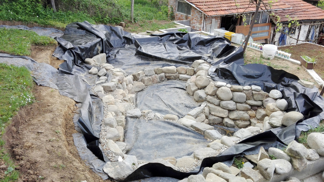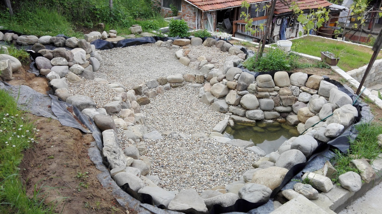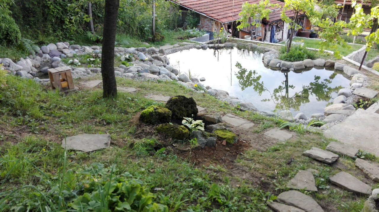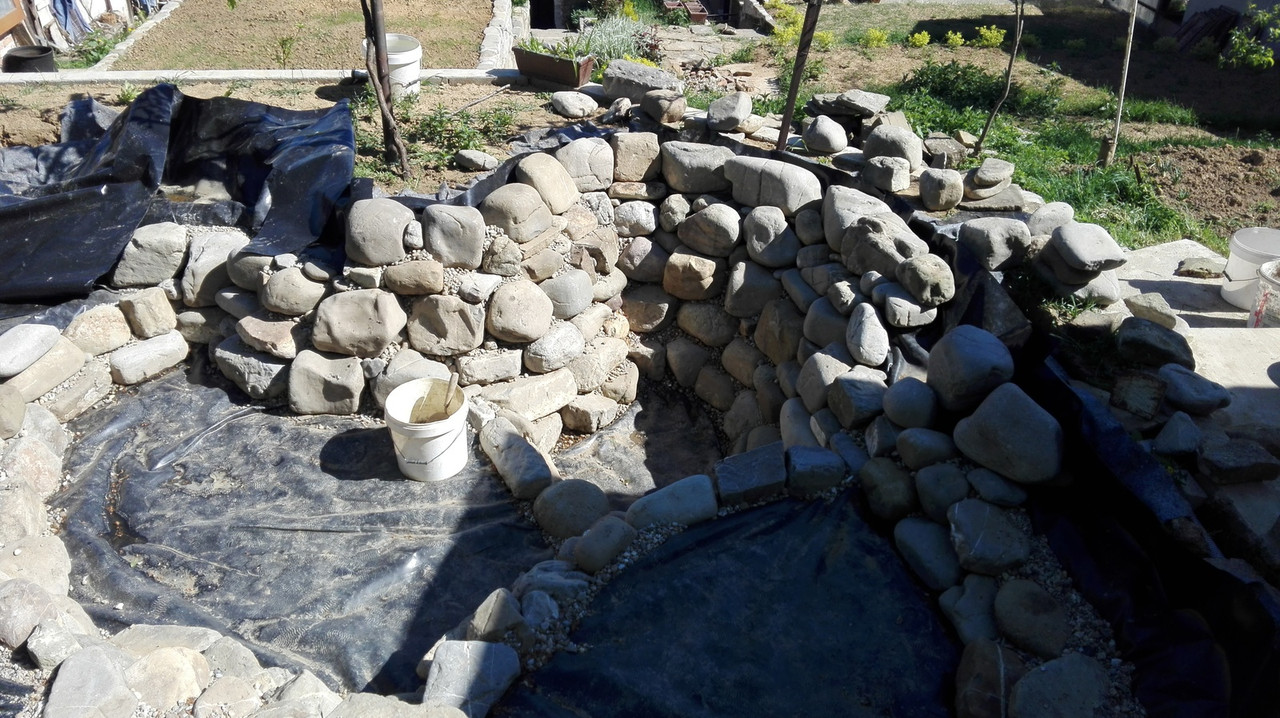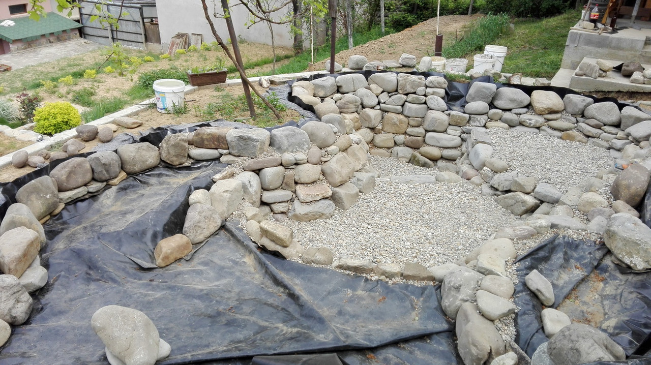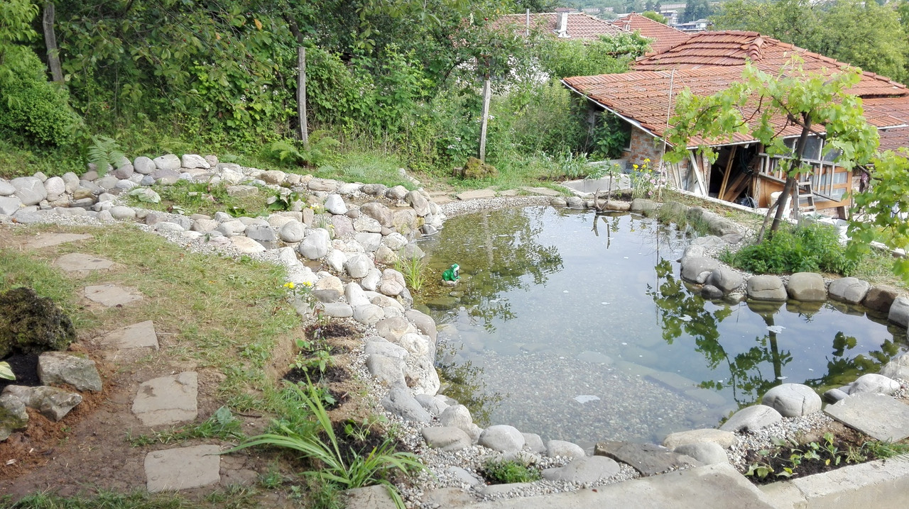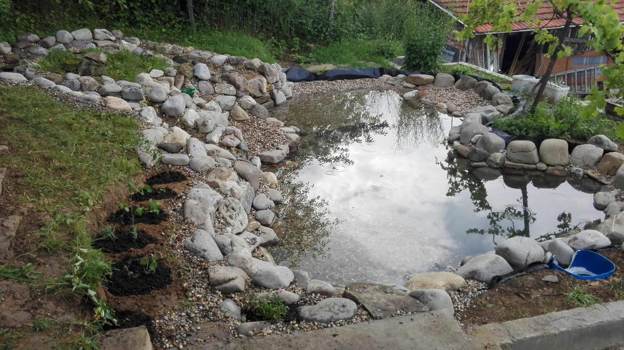 Много добре се получава , браво колега. Филца разбъркан ли е с цимент , ако не е може да се измие и камъните да паднат тук там но не е фатално. А дъното можеш да му направиш замазка силен разтвор цимент и пясък и докато е сурово още да растелиш филц  равномерно. Но така или иначе  след няколко месеца дъното няма да се вижда от какво е . Борда на езерцето как си го замислил , остави си повече запас от фолиото за да вдигнеш малко полезно е при силни валежи и вятър да не се пълни с боклуци и пръст. Късметлии са тези езерняци които имат по техния край такива камъни , аз не намерих.  Закопай си всички тръби и маркучи които ще ползваш за източване и доливане , спестява малко работа после. Предвиди си и преливник , при проливни валежи че съм виждал моето за 30мин. Порой как започва да прелива през преливника макар че до сега веднъж се е случвало ! Нивелирай г/д борда , да не дойде от единия край мн. Ниско а другия да се вижда голяма част от фолиото. Това се сещам за сега само като идеи  не са забележки , ако има друго ще пиша. Каквото направиш , това е вярното а корекции винаги ще има. Поздрави и благодаря за помпата супер е ;) Днеска реших да видя да не се е задръстила с боклуци щото е пуснах през скимера без кошничка за предпазване от едри боклуци , нищичко няма в нея явно всичко смила и най вече едни досадни буболечки дето ходеха по повърхноста на водата :D