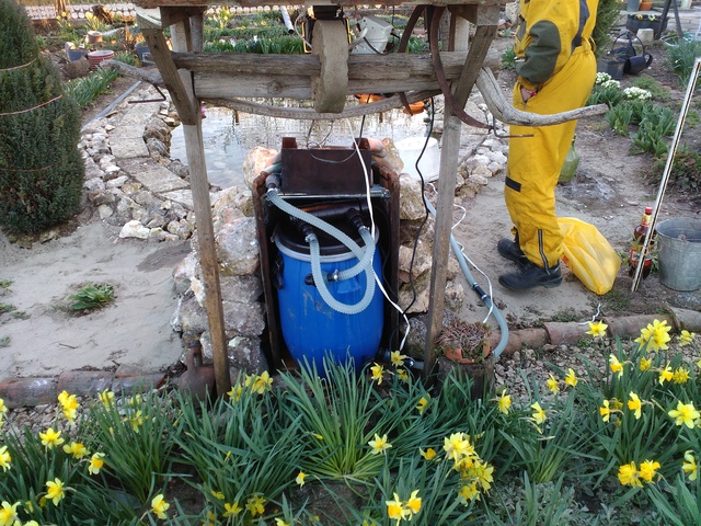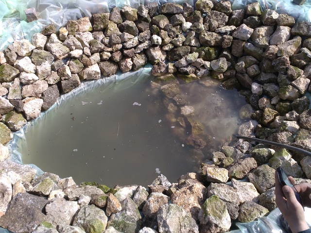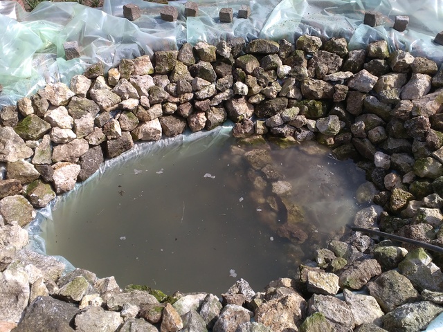 сомчетата се надяваме че ще оцелеят. Бидона е пълен с дунапрен на малки парченца в гаци. Помпата е 3000л. на час, достатъчна е за моето езеро, то е 7 кубика. UV лампата е 18w. по мощна от колкото ми е нужна за по добра евикастност.