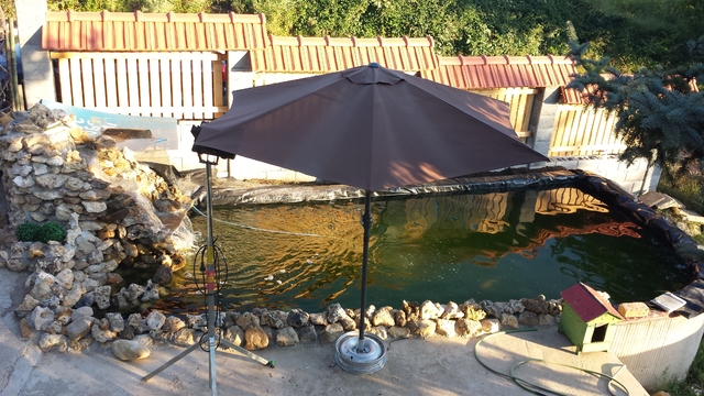 Вода 17 кубика 2 филтъра под налягане единия за езеро 7 000л с 9в ув другият за 30 000 л с 2 по 25в ув и 100 л вътрешен обем марката е sicce green reset 100 (уникален филтър)  захранвам ги с 1 помпа 18000 литра 210в . Изходите на филтрите сме вързали към водопада и от там се връща чистата вода в езерото много добре аерирана.Има и компресор за допълнителна аерация с огромно камъче за въздох което съм сложил в наи-дълбоката част на водоема