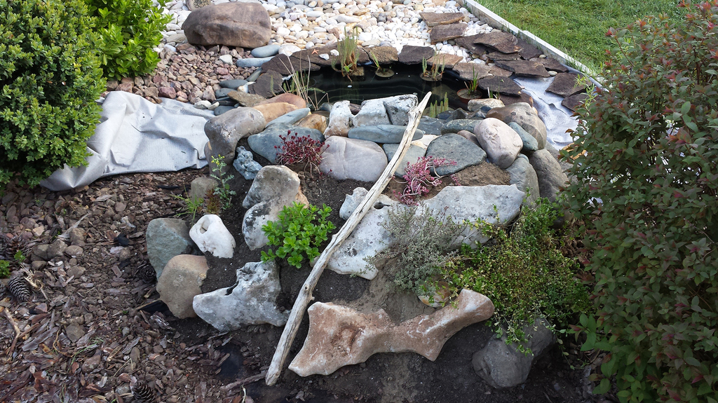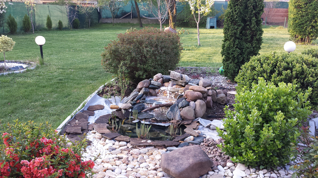 Ето до къде съм стигнал. Има още работа, искам да го изпипам. Трябва да скрия маркуча който се вижда, тук таме имам работа по найлона да се скрие. Дразни ме тръбата която е за шадравана и която няма да ползвам, така че трябва да я отрежа за да не стърчи. За съжаление езерцето е малко и саксиите на растенията заемат много място. Не мисля че мога да пусна една или две рибки. Непрекъснато се образуват балончета във водата, това нормално ли е? Ако има критики с удоволствие искам да ги чуя.