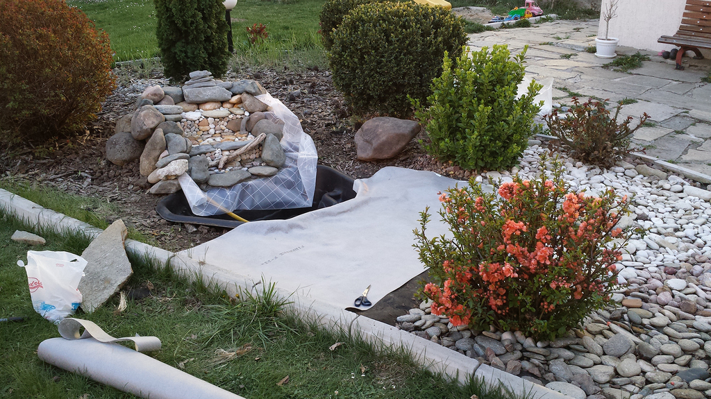 Ето до къде съм стигнал. Има още работа, искам да го изпипам. Трябва да скрия маркуча който се вижда, тук таме имам работа по найлона да се скрие. Дразни ме тръбата която е за шадравана и която няма да ползвам, така че трябва да я отрежа за да не стърчи. За съжаление езерцето е малко и саксиите на растенията заемат много място. Не мисля че мога да пусна една или две рибки. Непрекъснато се образуват балончета във водата, това нормално ли е? Ако има критики с удоволствие искам да ги чуя.
