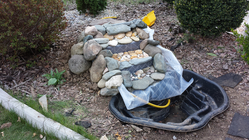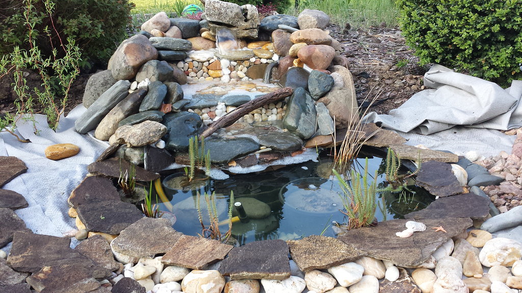 Ето до къде съм стигнал. Има още работа, искам да го изпипам. Трябва да скрия маркуча който се вижда, тук таме имам работа по найлона да се скрие. Дразни ме тръбата която е за шадравана и която няма да ползвам, така че трябва да я отрежа за да не стърчи. За съжаление езерцето е малко и саксиите на растенията заемат много място. Не мисля че мога да пусна една или две рибки. Непрекъснато се образуват балончета във водата, това нормално ли е? Ако има критики с удоволствие искам да ги чуя.