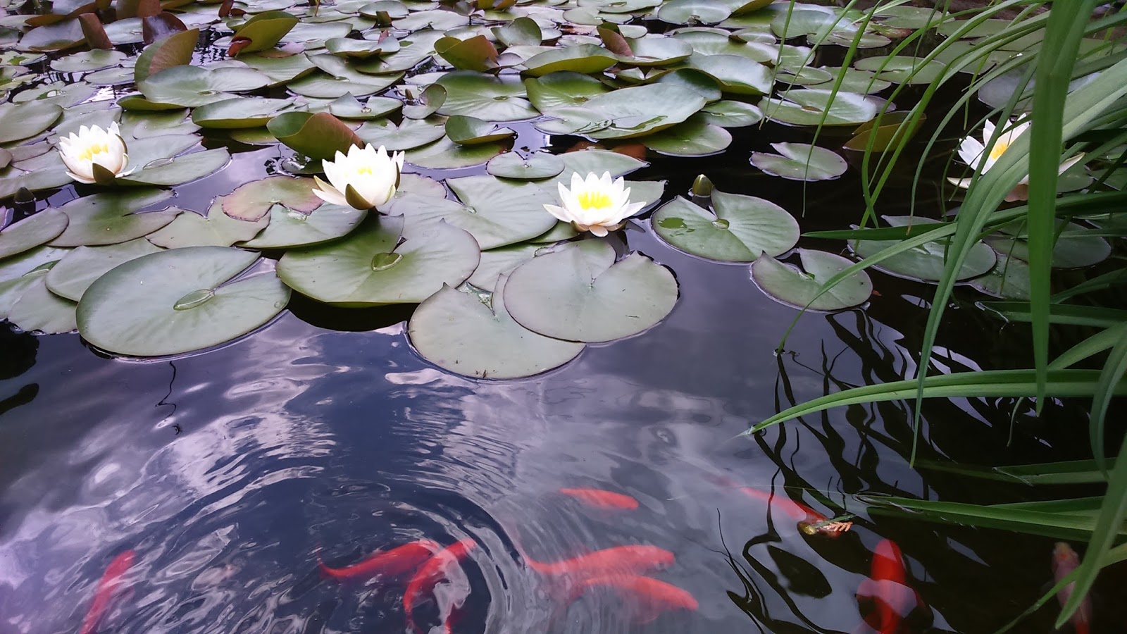 Овен водни лилии - три цвята има и водни растения, на които не знаем наименованията. Водните лилии никога не са пресаждани, но всяка година вадим да даваме на познати, които си правят езерца. Къде зарибени от нашето, къде от снимки от нета ...