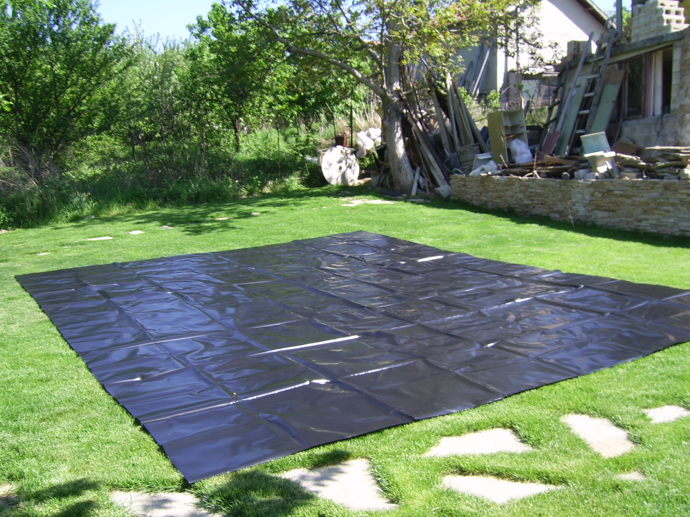 На следващата снимка е фолиото за градинско езеро. Всеки е виждал, но това което искам да споделя, е че размера е 6/4.5 ако не се лъжа, всеки се е интересувал грубо за 30 м2, колко пари струва по магазините или онлайн бг такивата. Та поради факта, че ми е писнало от бг измамници бих ви препоръчал ebay или конкретно това фолио е от amazon, английските. Цената на това фолио с 25г. гаранция е под 100лв. с доставката. Производство на hozelock. Тъй като ми се наложи да закупя 4м2 от бг мога да твърдя, че разликата в качеството е огромна, пропорционално на цената, но наобратно ...