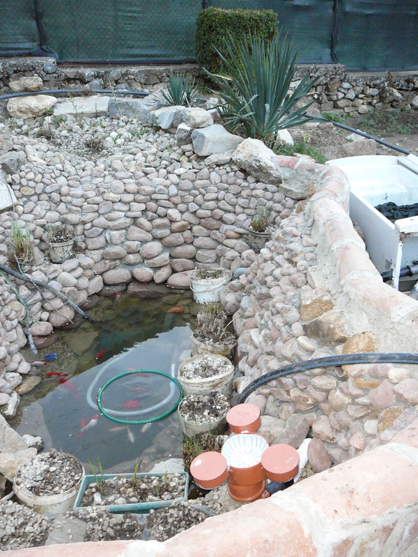 Не знам кога да пусна рибите заради цимента един ден го киснах цялото после  го източих и сега е с нова вода ,бидона е пълен с едропорест дунапрен и после керамзит и малко камъни .Отдясно от старото фолио мисля да скова едно дървено корито и да го напълня с керамзит и ситен речен чакъл и да садя зеленчуци ,аквапоника