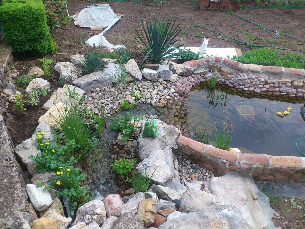 Облицовката е от керемиди лепени само отвън  с цимент и пясък и малко теракол ,притеснява ме вътрешната страна на стената се свличаше по малко цимент в камъните и като завали дъжд дали няма да го размие и вкара в водата ,иначе  дъното го лепих върху фолиото с цимент и пясък зелени камъни преди седмица .