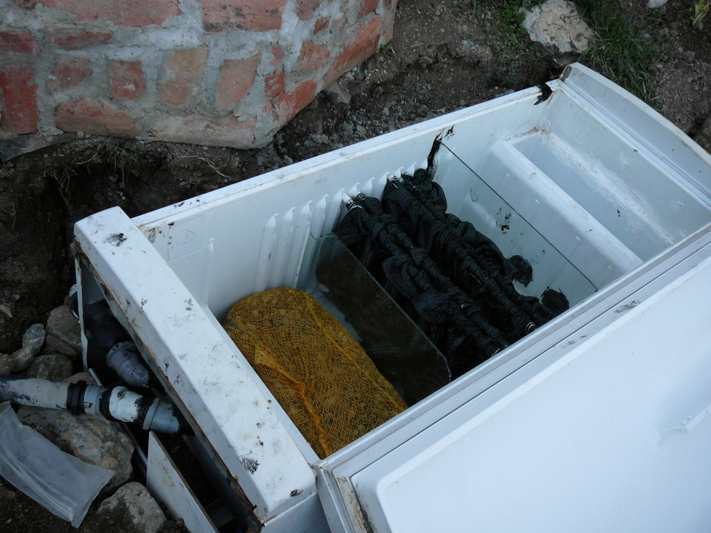 Не знам кога да пусна рибите заради цимента един ден го киснах цялото после  го източих и сега е с нова вода ,бидона е пълен с едропорест дунапрен и после керамзит и малко камъни .Отдясно от старото фолио мисля да скова едно дървено корито и да го напълня с керамзит и ситен речен чакъл и да садя зеленчуци ,аквапоника