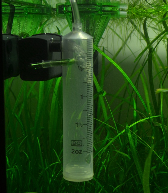 Това на снимката е голяма спринцовка с дупка в която е вкарана само горната част на малък вътрешен филтър. През зелената тръбичка натрупалия се газ се отвежда до входа на филтърната глава за да се разбие отново от перките вътре.