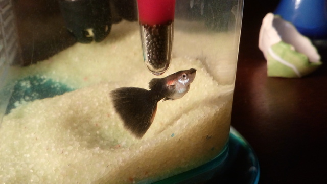 Първият ми въпрос е свързан с най-скорошният обитател на аквариума ми. Става на въпрос за една гупа "черен принц". Взех я уж за бременна женска, но стана вече седмица не е родила, а е доста наедряла. Днес я загледах по-обстойно и забелязах едно шипче на коремчето й, и си викам "Гати късмета, бременен мъжки :)". Ето малко снимки, надявам се да помогнете да установя пола на рибето.