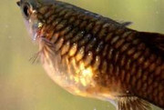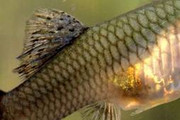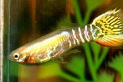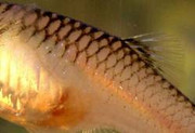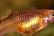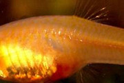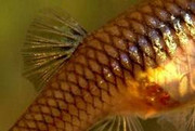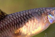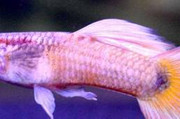 Снимка 10.Самец гупи с розов фонов цвят. На гърба (където няма покриваща окраска) добре се забелязват признаците на розовата основна окраска – люспи с черна ивичка по края.