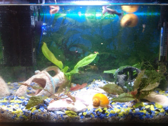 4 спасих от общия аквариум, но в момента виждам само 3. И тва е - нищо - вдигнах и температурата до 26 градуса, тц, няма никой. Мисля довечера да я местя в общия, че идва № 2  - единия мъжки само я гони настървено... Между боядисването на яйцата и козунака израждам и риби, но поне ми е весело :-).