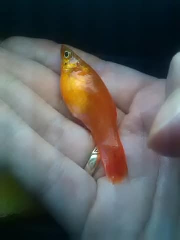 Вижте, декоративните рибки НИКОГА не се вадят с ръка. Стресът от изваждането дори с кеп може да е голям, може да загуби малки (ако има такива),  а и така може да сте я наранили. Ще отговоря следното. Възможно е да е бременна, ако не сте я снимали след хранене. Снимката трябва да стане сутрин преди да са хранени рибките, като последните трябва да са в АКВАРИУМА и с ВОДА, СПОКОЙНИ. Съветвам ви да прочетете статиите относно това как се създава аквариум, как се подготвя, кога и какви рибки се пускат в него, по какво се познава дали са бременни и тогава може да питате отново.