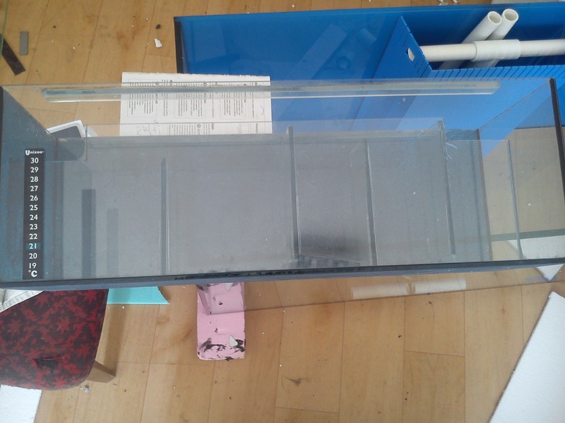 Залепяме ги на гърба на аквариума и след като сме направили това си изрязваме едно парче стъкло с размери на вътрешната височина на аквариума или в моя случай до разпорките като се изрязват двата края на стъклото показано на следващата снимка за да може по късно да се изгради преливната решетка  и изходната вода.