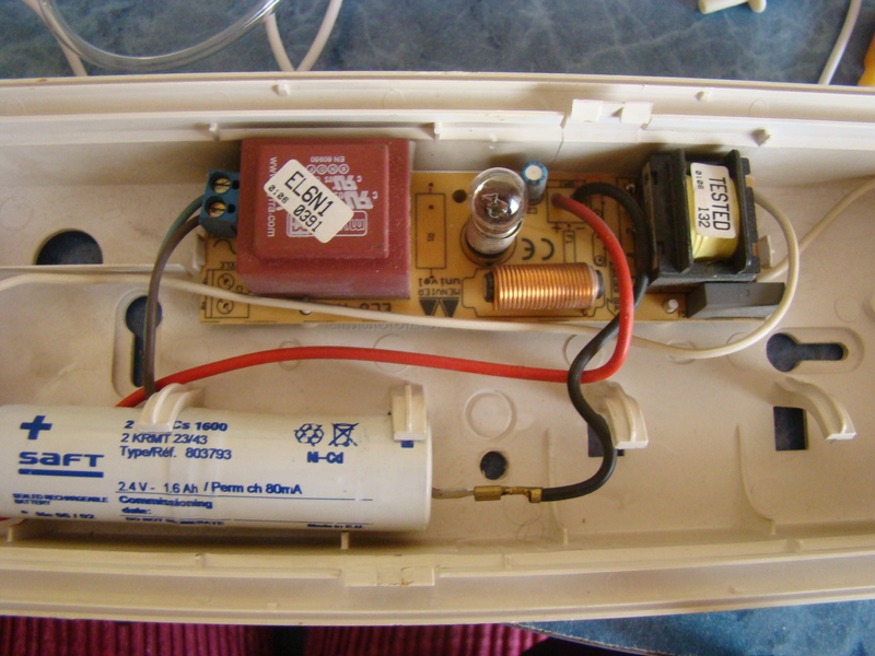 Кондензатори няма за какво да търсиш. Това което аз бих направил е да меря с уред. Включвам лампата за 24 часа да зареди батериите после я изключвам и разглобявам и меря. Идеята е, че на нея пише 12волта което ме навежда на мисълта, че батерията подава 2.4в на входа на трафа. А на изхода му излиза 12 волта. По лесно е да се намери адаптор на 12 волта. Целта е да се измери изходното напрежение на трафа и ако то е наистина 12волта може да се анулира трафа и батерията а на мястото на изхода на трафа да се подаде напрежение 12волта от адаптера. Но не знам дали си струва да се изтанцува този танц при положение, че може да се мине с една енергоспестяваща. Ако ти е за аквариум де.
