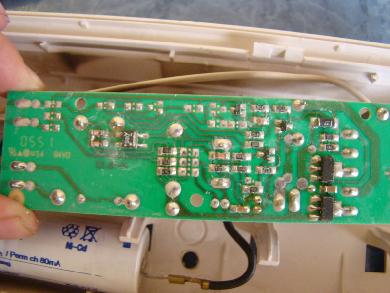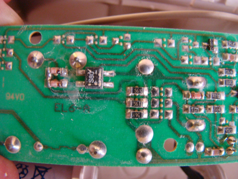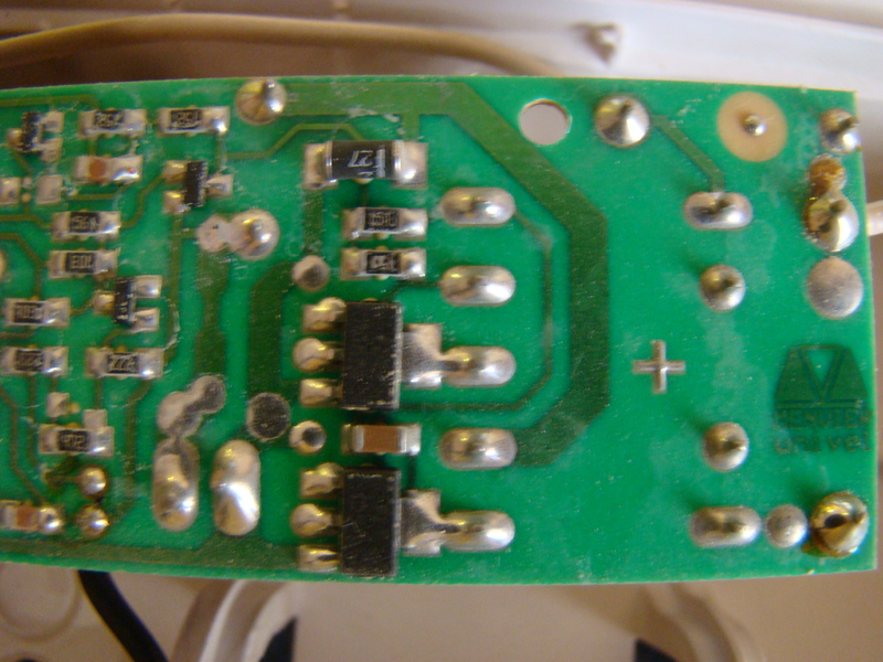 Ами тази лампа е доста стара като изпълнение като гледам. Червеното на платката е повишаващия траф. Ако решиш да го правиш ще е играчка за да свалиш на 2.4волта. Аз също не съм срещал толкова малък адаптер най малкия който ми идва на ум е от GSM. Те мисля са на 3-3,6волта. Като цяло идеята е да ориентираш правилно плюса и минуса от адаптера. Но ако е с по високо напрежение от това на батериите има риск и на изхода на трафа да излезе по високо от необходимото и да се прецакат нещата. И в тази връзка те съветвам да не си играеш тока е опасно нещо.