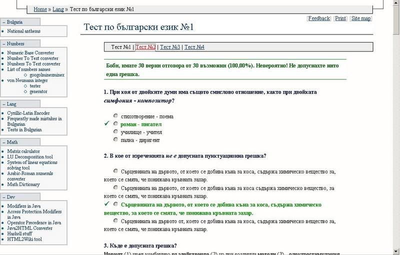 "Имате 26 верни отговора от 30 възможни (86,67%). Показахте доста добри познания по български език".