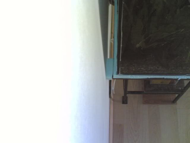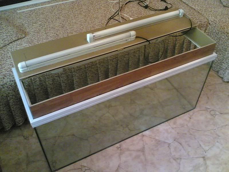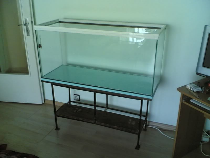 Друго си е новото стъкло,без грам драскотина,кеф.Ползвах старата стойка,не ми се занимаваше да поръчвам нова,а и достатъчно ме успокоиха че тази ще издържи.Надявам се да е така че иначе 220л.вода в хола...не ми се мисли.Остава ми само да облека стойката с ламинатни плоскости и аквариума да придобие завършен външен вид.