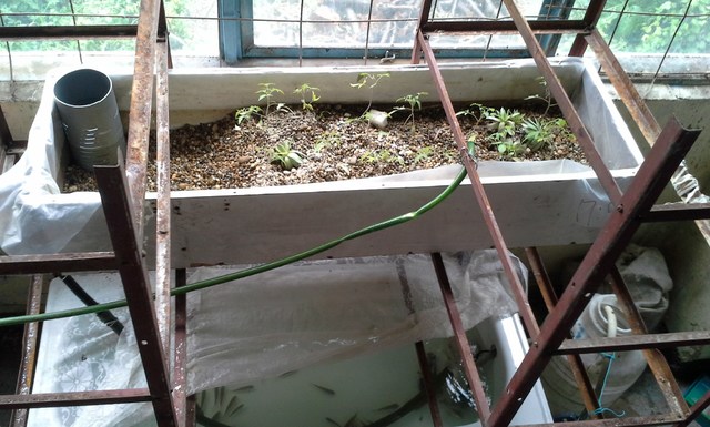 Отскоро съм се запалил по аквапониката /съвместно отглеждане на риби и растения/, а нямам никакъв опит с отглеждането на риби. Пиша с подробности защото се надявам някой да помогне за решаване на проблемите. Направих си аквапонна система- в една метална вана завъдих каракуди около  60 бр. и 7 червеноперки. В един сандък засях няколко корена домати. Почвата е едър промит речен пясък. Ваната е скачена с бидон, от който водата се изпомпва към сандъка с доматите. Водата би трябвало да захрани растенията, да се пречисти и през направения в сандъка сифон да се върне при рибите. Преди да се влее във ваната на края на маркуча съм увил вата, за да филтрира допълнително.