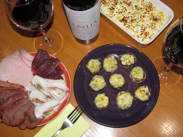 Отстрани царевица със сметана,гъби със синьо сирене и мезета...