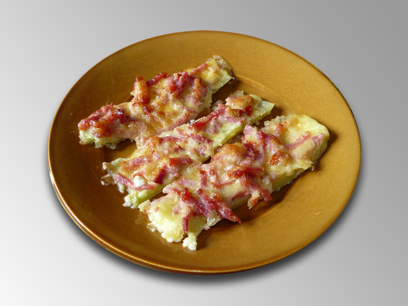Обелваме тиквичките и ги нарязваме по дължина. Нареждаме ги в намазана с олио тавичка. Настъргваме кашкавал на едро ренде, нарязваме пушеното на тънки ивички и ги смесваме в голям съд, заедно с майонезата. След като всичко е равномерно разбъркано го слагаме върху всеки един резен от тиквичките. Печем на 180-200° за около 15 минути или докато кашкавалът се разтопи.