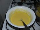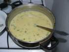Внимателно, на малки порции и с разбъркване, сипваме от супата в купичката със застройката, докато сместа се стопли достатъчно, за да не се пресече яйцето. После изсипваме обратно в тенджерата, продължавайки да разбъркваме.