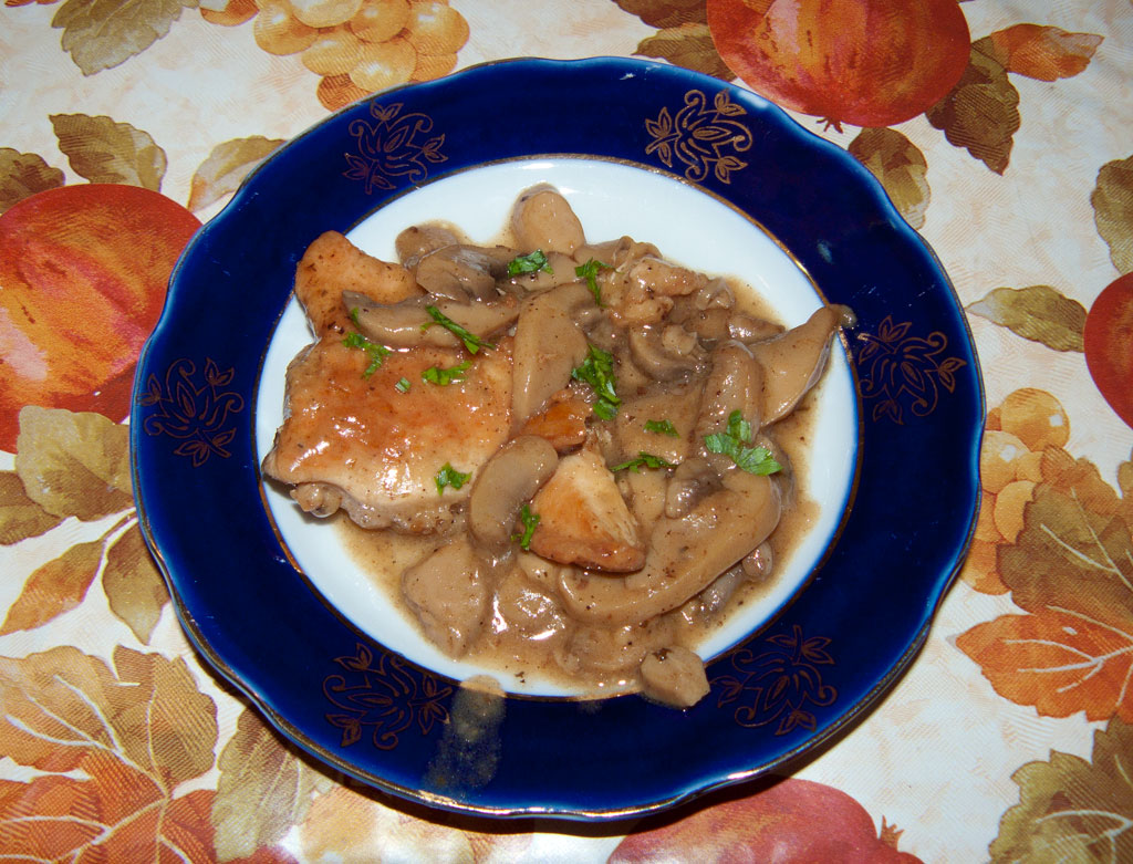 Гърдите се измиват и нарязват на тънки пържолки. В плоска чиния се смесват брашното и подправките. В дълбок тиган или тенджерка се налива олиото, добавя се маслото и когато се загреят добре, се добавят оваляните в брашнената смес парчета месо. От едната страна се запържват до златисто. От другата се запържват 20тина секунди. Заливат се с виното и се затрупват с тънко нарязаните гъби. Слага се капакът и се задушават за 10тина минути.