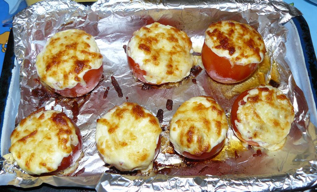 Доматите се измиват, отгоре се изрязва по-тясната част. Сърцевината се изважда с малка лъжица. Отцедените, запържени кубчета се слагат в доматите. Слага се дебел слой майонеза, а отгоре се настъргва дебел пласт кашкавал.
