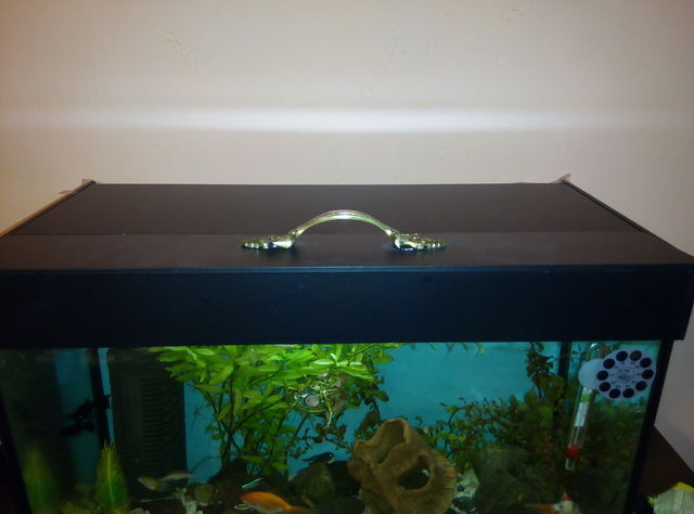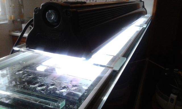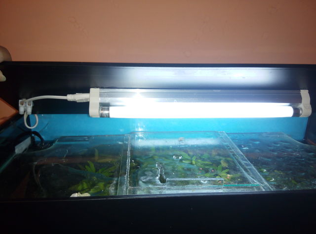 Не идята ми е да използвам вече съществуващия капак който е от две части,да го фолирам с черно и да залепя лампата там,тои има дръжка,а ще отварям другия който е по тесен,и от там ще ги храня,звъпроса ми е дали е проблем лампата да свети директно във водата.