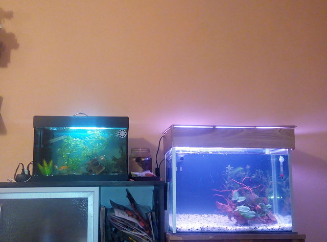 Здравейте отново,капака е почти готов и ще пусна снимки,сега искам да ви попитам за осветлението,към момента съм се спряла на лампа 55см.24W т5,искам да гледам растения,около 2-3,но бихте ли ми препоръчали какви по точно,рибите ще бъдат неони и кленовидни разбори и анциструс.На снимките ми имам две растения на които не им знам имената и едното (зеленото)ще го преместя там,защото златните му взеха акъла,което вече разбрах че е напълно нормално:).Тъй като съм решила да поставя корен в средата,ми се иска растение с големи и плътни листа, а за валиснерията какво ще кажете,по зоомагазините не ми го препоръчват.