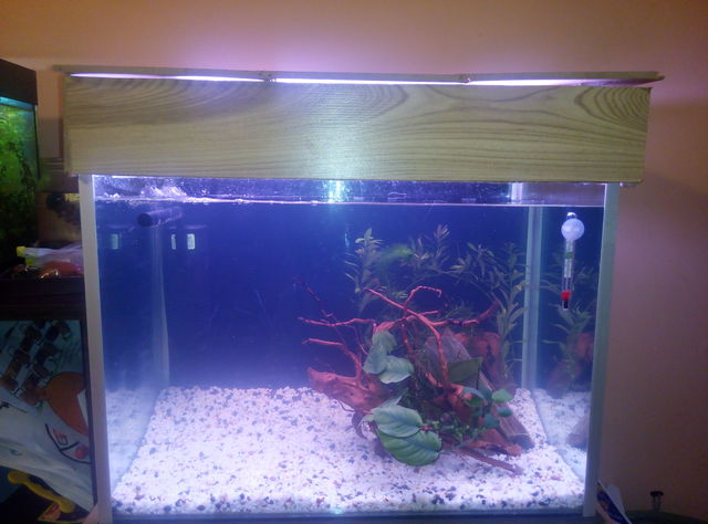 И така,лека по-лека му се вижда края,капака го направих, но не е перфектен,но с подръчни материали толкова, с лампата ми беше много трудно и варианта ставаше само по диагонал,специална е т8 за цветя F18W.Фолиото ми остана на места на балони,четох,избутвах с по твърд предмет в кърпа,пуках с карфица,да приемем че фолиото е кофти:).Грунда си го харесвам.Машинката е 900л/ч.Корена сто пъти го вътрях така според мен стои най-добре,а и на сина ми му приличало на фламинго :).Синята рибка е дело на сина ми:).Аз лично си харесвам до момента работата,защото се справих сама и го правих с голямо желание.Утре ще засаждам и ще пълня.