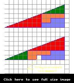 Погледни зеления триъгълник. Наклона на неговата хипотенуза е такъв, че за 5 "крачки" (долната, хоризонтална страна на зеления) "качва" 2 тухлички нагоре. Хайде сега мери 10 крачки от долния ляв ъгъл на цялата фигура, това което твърдиш, че е триъгълник. Ако наклона е еднакъв (трябва да е еднакъв ако голямата фигура е триъгълник и няма "чупка" на "хипотенузата") ако мерим от долу вляво 10 "крачки" надясно, наклона трябва да е качил 4 тухлички нагоре, нали? Да, ама не. Качил е малко под 4. Това значи че някъде наклонът се променя
