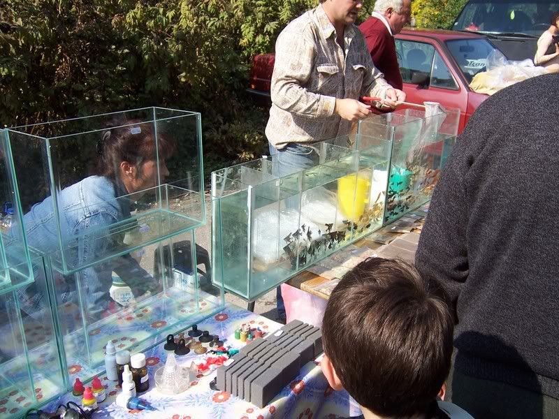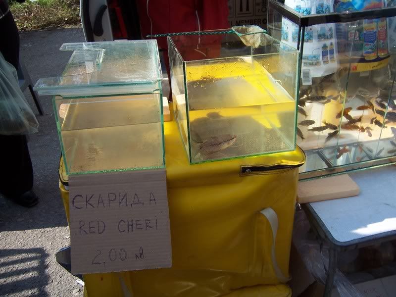 Този път имах чувството, че пазарът беше доста по-голям от пролетния. Имах идея да разменим някакви координати с тези, които ще идват, както бях писал в една друга тема, за да можем дори и за малко да се видим на живо и по едно здрасти да си кажем, обаче ни притисна времето и ние още към 8:30 бяхме там, понеже много неща трябваше да се вършат в Съботния ден. За това предварително не се разбрах с никой, че идеята беше на бързо да метнем по едно око и да се изнасяме. Не знам колко сме бързали ама в 11:00 още бродехме между сергиите  :-D. Буквално за съвсем малко се завъртяхме покрай щанда на Big Gonzo и си взехме растения и едни таблетки за подхранване. Аз набързо успях да му кажа, че ние сме Шуменската група и изчезнахме по задачи. Много съм доволен от Ехинодоруса, който си взех от него, понеже коренно промени визията на аквариума и изпъкна много добре на фона на останалите ми треволяци. Харесах си още много ниски растения, обаче пустото CO2 не съм го довършил и не ми се рискуваше. Купих си нагревател 250 вата на Aquael, със 7 лева разлика в цената от магазинната в Шумен. После се оказа, че тази фирма, от която го купих снабдява и тези магазини тук. Искам да кажа, че за мен този пазар беше много полезен и някои неща наистина могат да се намерят доста по-изгодно. Не си тръгнахме празни както казах, дори единият от нашата група си купи 40 литров аквариум за 175 лева (от тези, които се виждат горе на снимката), с всички работи вградени в него. Голям проблем имахме с излизането от зоната на пазара, понеже на паркинга, на който сутринта си нaмeрихме лесно места, бяха решили, че няма нужда да оставят място за излизане и стенаха големи панаири. Не знам другите които сте дошли по-късно къде паркирахте и имахте ли проблеми но това всъщност е неизбежно като има толкова хора на едно място  :-)
