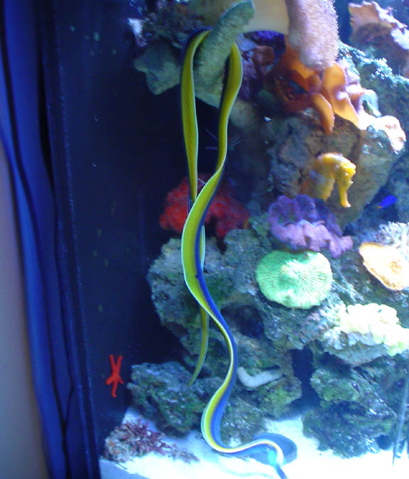 Black Ribbon Eel, Blue Ribbon Eel, Yellow Ribbon Eel или Rhinomuraena quaesita е може би една от най-трудните риби за отглеждане в плен. Както и при Занклуса захранването им е мисия невъзможна за по-голямата част от акваристите. Направо е невероятно, че пет години сте успели да я отглеждате. За съжаление когато не са двойка,  Синята ивичеста змиорка рано или късно приема мъжки пол и променя украсата си в черно и жълто, т.е. синьо-жълтата украска е характерна за възрастните екземпляри от женски пол. В много сайтове могат да се видят призиви да не се опитва отглеждането им в аквариум, поради почти стопроцентовата им смъртност до месец след залавянето им в плен. Бях решил да се сдобия с двойка от това невероятно създание, но след по-внимателно проучване се отказах. Евала за този успех!