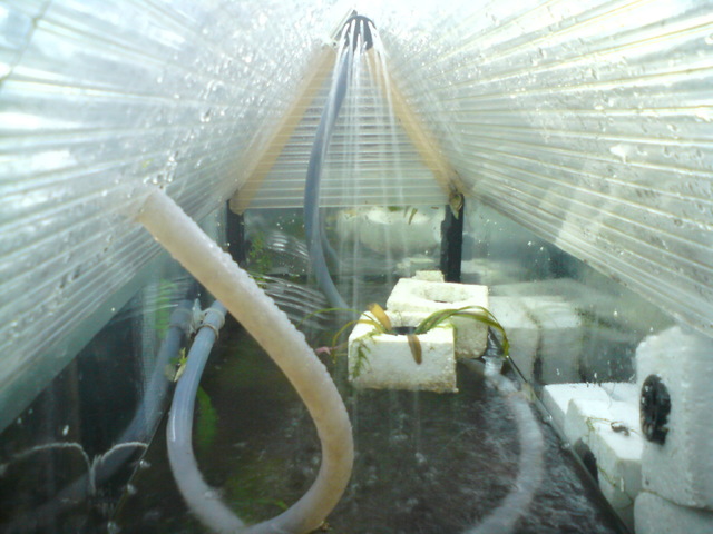 Преди в колибката имаше дна тръба със закачена мржа в нея и водата течеше през нея за да се образуват водорасли, но такива се образуваха и по ехинодорусите в аквариумчето и по стените защото светеше по 12ч на денонощие и я махнах и сложик накрайника за фонтан който се вижда на снимката фронтално. Мъркуча на предния план качва водата в съндъчетат над аквариума и от там тя влиза в него диагонално на мястото на преливника.