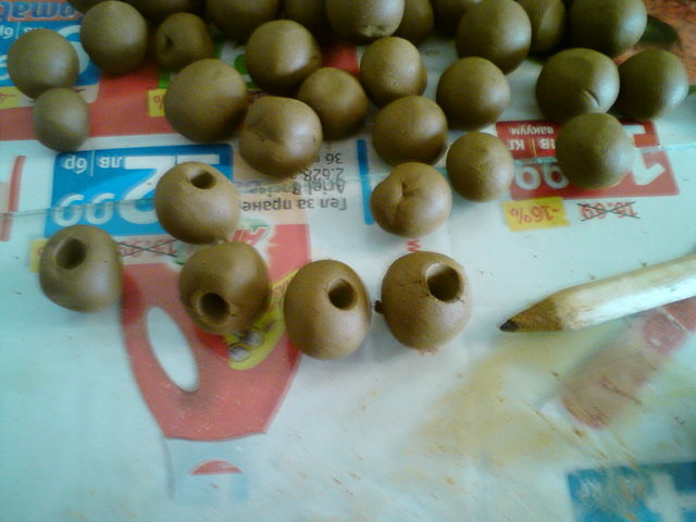 От кубчетата направих топчета и с помоща на молив пробих по една дупка във всяко топче.