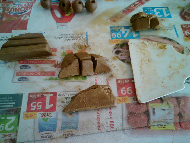 След като разместих по-голяма част от растенията реших да направя и малко глинени топчета за да ги подхраня на новите им места. Взех топка глина и я нарязах с пластмасова шпакла на филийки, после на ивици и след това на купчета: