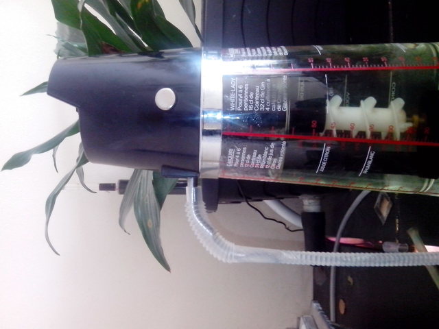 Сдобих се с този миксер от 70-те години и след като го ремонтирах и го ползвах няколко пъти по предназначение реших че ще ми свърши идеална работа за ежедневното торене на аквариума. Просто вместо доматен сок, черен пипер и сол сипвам в него доза тор с мерителна лъжичка добавям и вода догоре. После с натискането на единия бутон се задейства шнека който разбърква и разтваря за около минута съставките. След това слагам мущука на шейкъра в една тръбичка която влиза в аквариума и с натискането на втория бутон започва изсмукването на течността и отвеждането и в аквариума.