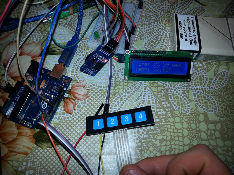 Температурен сензор DS18B20, RTC модул DS3231 (кварцов, температуро независим). При спиране на тока, или изключване, реално време се поддържа от стандратна CR2032 батерийка :)
