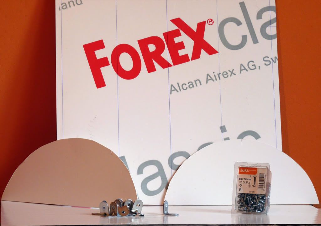 Използвах FOREX с дебелина 2мм-достатъчно здрав и еластичен материал.А и 2-та милиметра се режат лесно с макетно ножче.