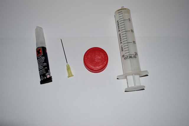 Върху пластмасовата част от иглата се капва малко каноколит и се постава в пробитият отвор: