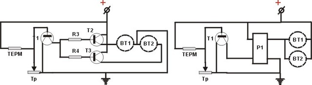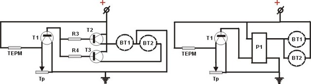 Не мисля, че има грешка при Т1. Ако виждаш такава кажи, може да пропускам нещо. Но Т1 си е транзистора от първата схема. Ползвал съм нея като съм добавил елементи. Примерни стойности според зависи, за базови съпротивления на Т2,3 може да се ползва 10к резистори. Транзистори Т2,3 се подбират според мощността на вентилаторите. На другата схема е дадено реле Р1 при него няма особеност просто едно контактно реле с нормално отворен контакт. Въпроса е да е на напрежение на което работи схемата примерно 12в. Както и да се вземе под внимание товара на вентилаторите за да се знае колко да е мощна контактната система на релето.