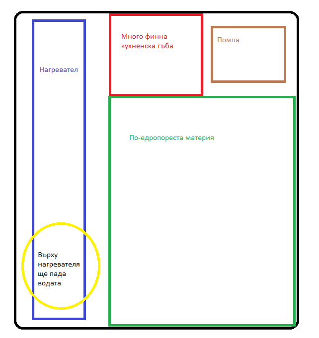 Ще използвам преливник, пластмасова кутия в която ще е филтриращия материал, нагреватеря и помпата, която ще качва вода обратно в аквариума.