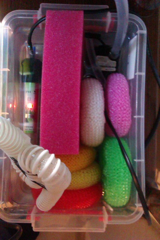 Филтъра има една много дребна гъба и няколко пластмасови телчета за съдове. Около 1,5 литра е самия филтър, аквариума е 7 литра.