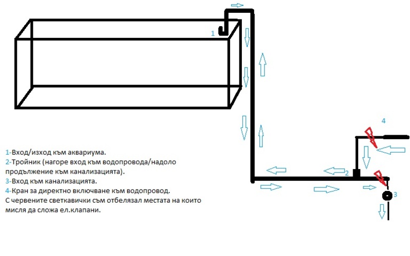 Като цялостно  замисъла е добър но има още недомилсености. От чертежа се вижда, че ще дърпа вода само от горните слоеве което създава предпоставка за натрупване на органика по дъното. Освен това , какво става ако входа е с малък дебит (налягане на водата) или изхода е затлачен? Предполагам трябва да помислиш и за аварийен вариант със сензор на определено ниво  който да спира притока на прясна вода+ втори сензор  който да задейства  потока прясна вода когато дстигне  долно  (зададено) ниво. Това с таймерите на включ/изключ е само за времето в което да се задейства машинарията- ден, седмица, месец или так дале. По този начин който ти предлагам става с програма на комп и всичко си е тип-топ. Сензори могат да се  набавят като тези по пречиствателните станции следящи нивото и потока на вода по канализациите като и програмата е предполагам почти същата с малки изменения което един програмист може да направи за да служи за замисъла който си започнал. Дано съм помогнал  и с моите "недомислици" по този проект който също ми е в някакви необозрими бъдещи планове и изпълнения. *DRINK*