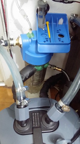 Водата излиза от аквата минава през канистъра филтрира се и отива във филтъра(реактора където разтварям и С02)охлашда се и се връща обратно в аквариума.Може да не изглежда много красиво но върши работа.