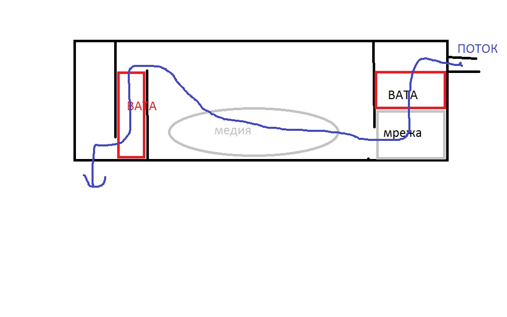 беше така отначало сложих медията под ватата но новото на водата беше ниско и след 20-тина дена всичко започна да мирише на мухал. може да сложа още една преграда да станат 2 вати една след друга и да намаля височината на последната. единственото което ме притеснява е да не се позадрасти ватата и да започне да прелива