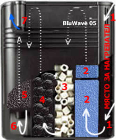 Не е ли по-добре във второто отделение, филтърната медия да е под ватата. Така, както е в момента, всяка по-едра частичка, преминала през първото отделение ще попада в медията. Доколкото виждам, водата преминава от едното в другото, някъде по-ниско и медията не се обтича, а само се кисне. Другото е, че всеки път, когато трябва да изплакваш ватата, ще трябва да вадиш и мрежичките с медията.  :-)