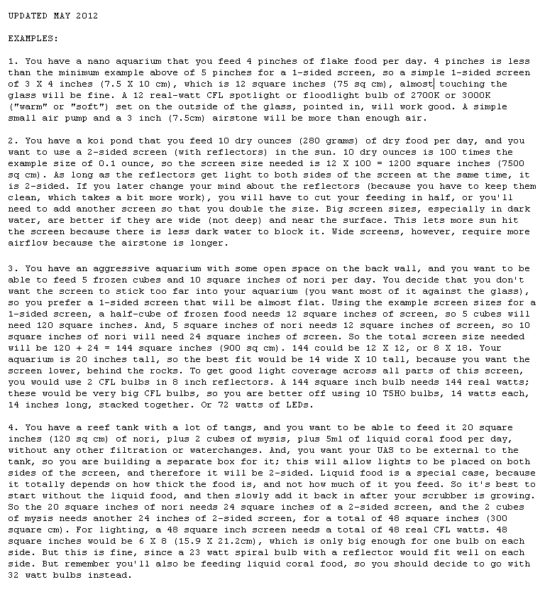 JohnnyB_in_SD on the RC site: "I feed about 6-7 cubes a day on a 100gl tank, and 10-12 cubes two days a week when I do the nems & corals too. N&P have been undetectable since I started using ATS, which is a mickey mouse rubber maid tub version. Since I am always looking for the easiest way to do everything, I will continue cleaning the whole screen once a week. For me, it was a real struggle maintaining water quality with just a fuge: starving my fish, super skimming, massive weekly water changes - just to keep Nitrates near 20ppm and Phosphate under 1.0. That all went away with an ATS, the hobby is much more enjoyable and not a huge chore."