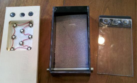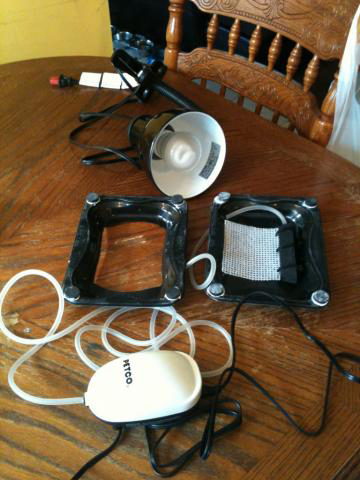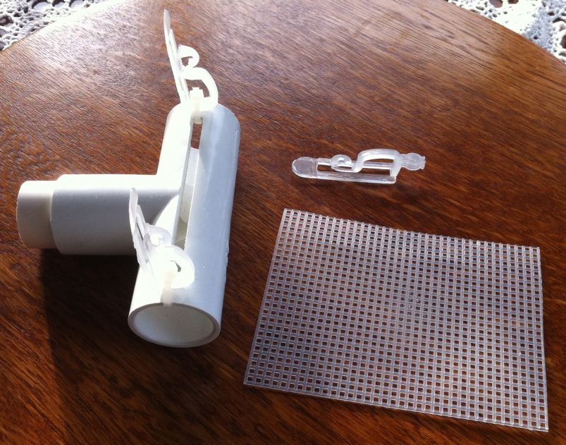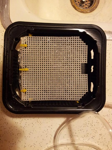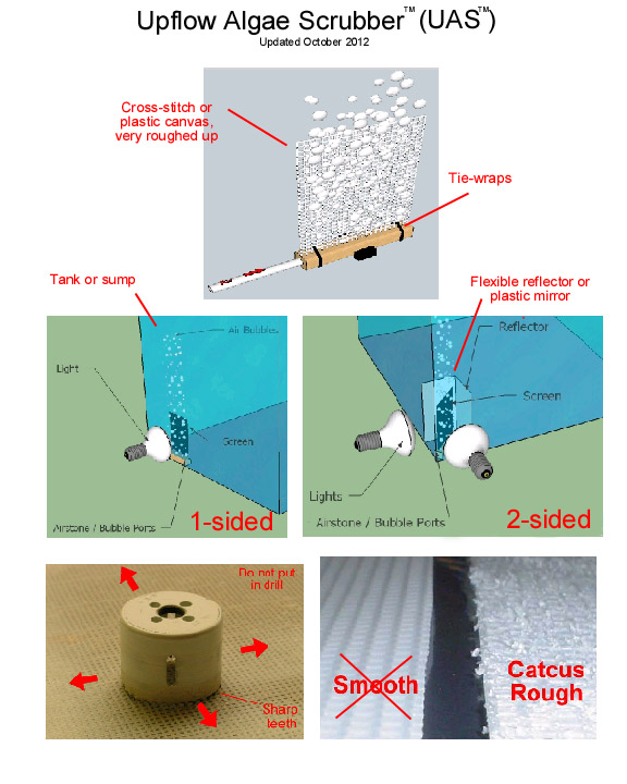 The most basic way to set up an Upflow Algae Scrubber, especially in small aquariums, is just to put some air bubbles beneath a vertical screen. If inside an aquarium, you just put a light on the outside of the glass, so that it shines inside to the screen. And if you want better performance (which means better filtering), just add a reflector to give the screen some light on both sides. The screen is best made with 7-mesh cross stitch plastic canvas that you get at sewing or craft stores, or online. Also, don't forget to rough up the screen with a sharp object like a hole saw; the screen should be so rough that the screen holes are almost filled in with all the little pieces of plastic that you roughed up.